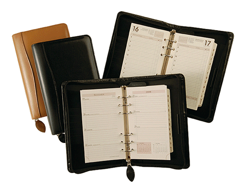Features : " x " 6-ring binder with bonded leather cover. Has multiple card slots, interior pocket and zippered closure. 324 pages. Day-to-a-page format. To Do & address pages. A-Z & monthly tabbed indices. Page locator.